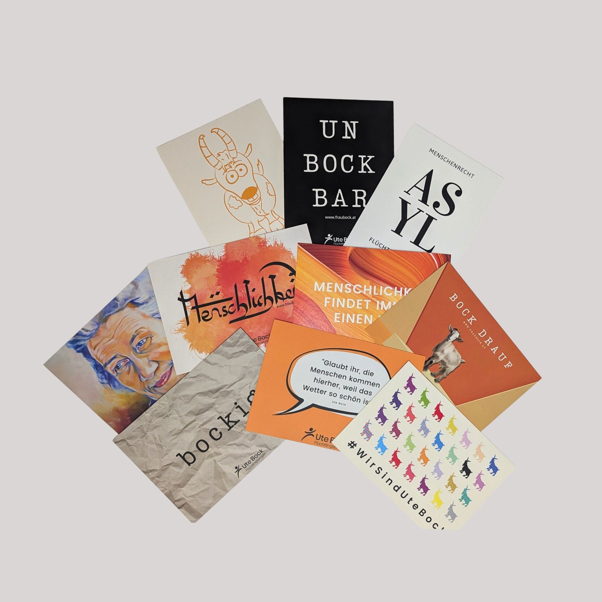 Für neue und alte Fans des Flüchtlingsprojekts Ute Bock! Hol dir dein individuelles Postkarten-Set mit einer Auswahl unserer bockigen Postkarten. Verschicke Menschlichkeit und zeige Haltung.